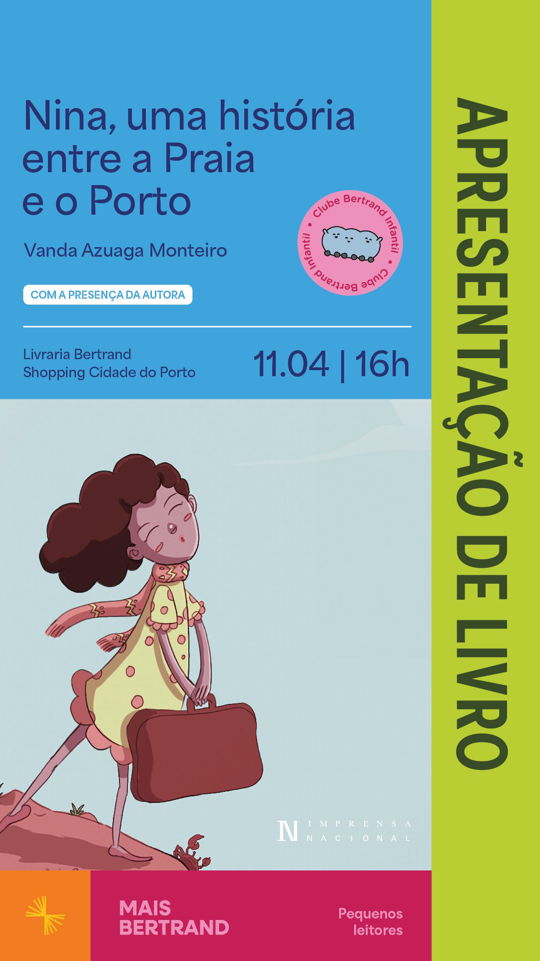 No dia 11 de abril, às 16h, a Livraria Bertrand do Shopping Cidade do Porto recebe a apresentação do livro infantil Nina, uma história entre a Praia e o Porto, da autora Vanda Azuaga Monteiro.
